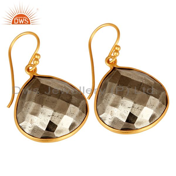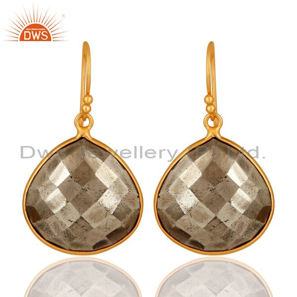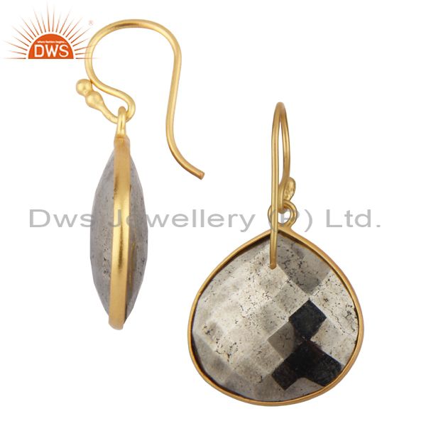 14K Yellow Gold Plated Sterling Silver Faceted Pyrite Bezel Set Drop Earrings