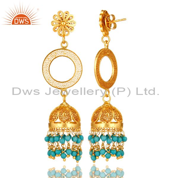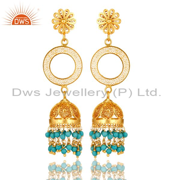 14K Yellow Gold Plated Sterling Silver Turquoise Filigree Jhumka Dangle Earring