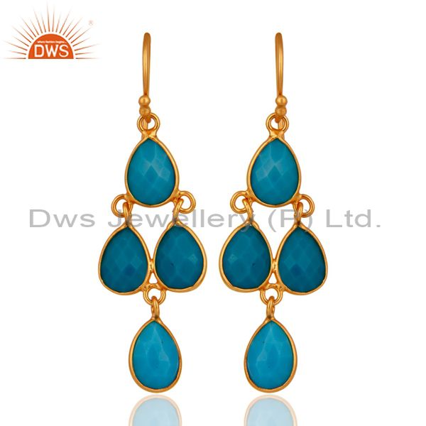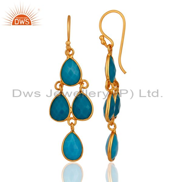 14K Yellow Gold Plated Sterling Silver Turquoise Gemstone Bezel Dangle Earrings