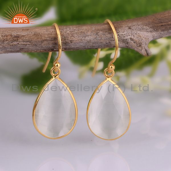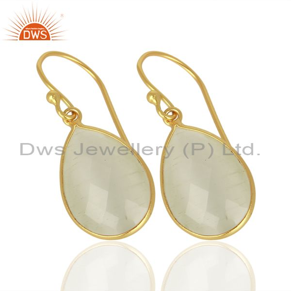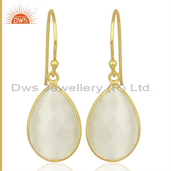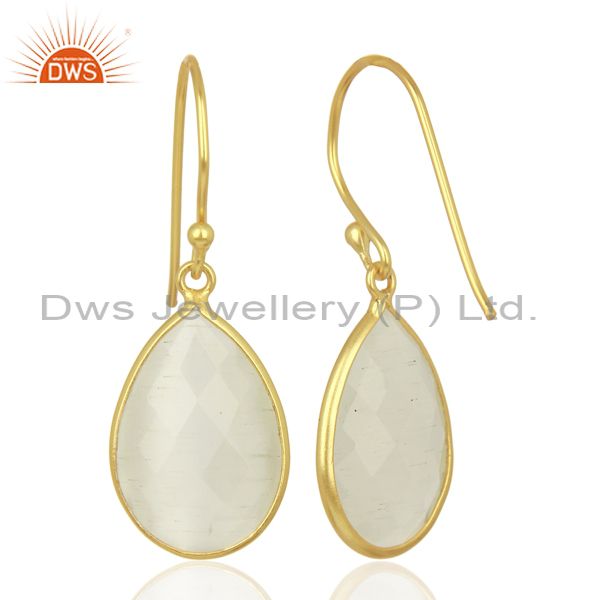 14K Yellow Gold Plated Sterling Silver White Moonstone Bezel Set Drop Earrings