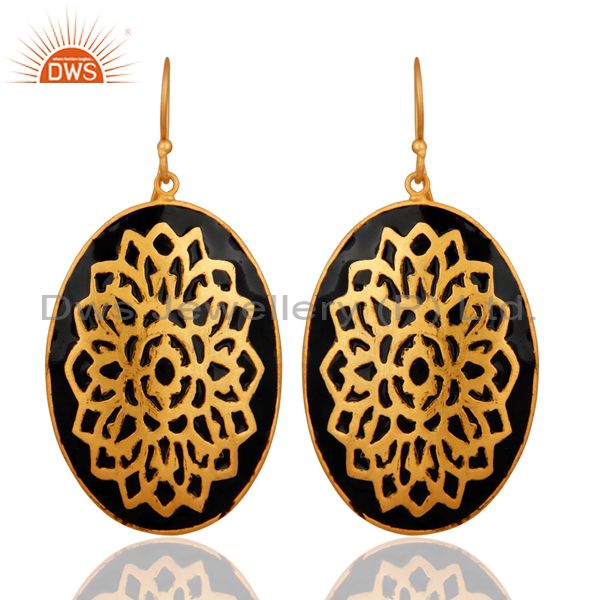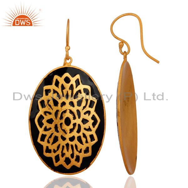 14K Yellow Gold Plated Traditional Handmade Black Enamel Dangle Brass Earrings
