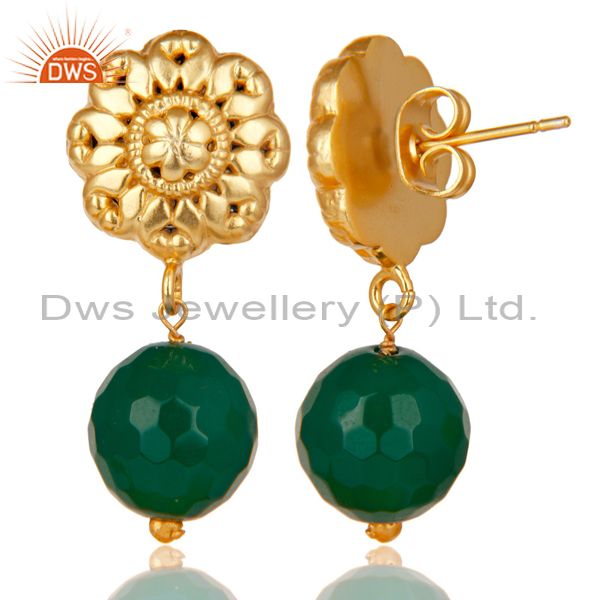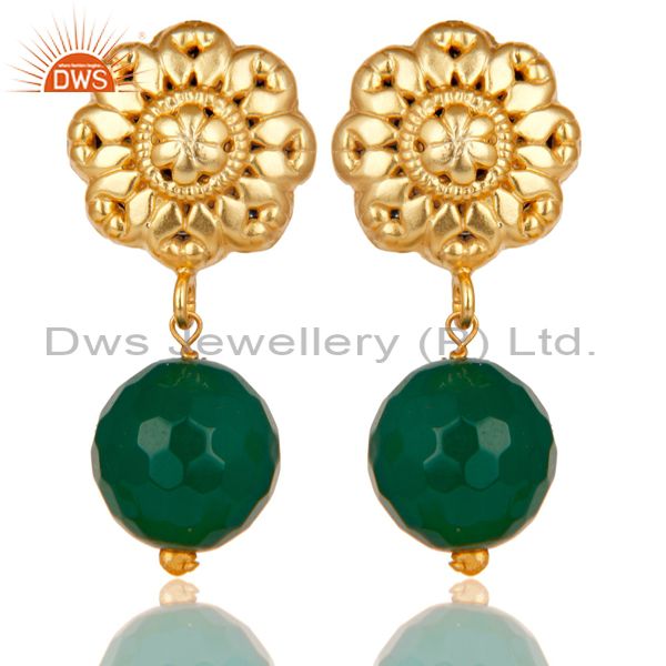 14K Yellow Gold Plated Traditional Handmade Green Onyx Drops Brass Earrings