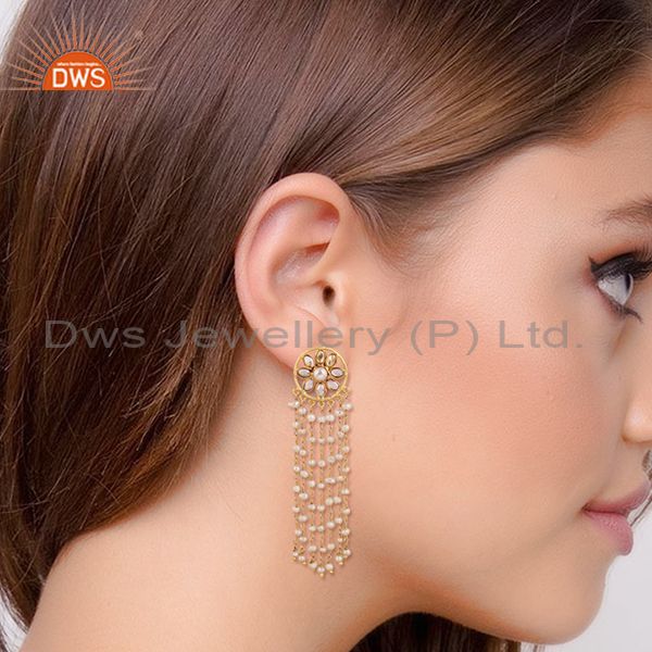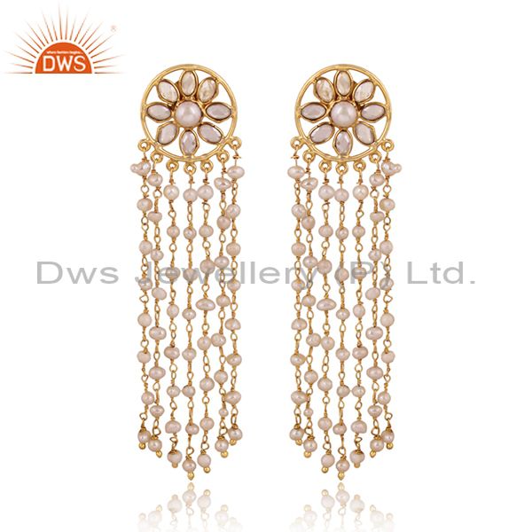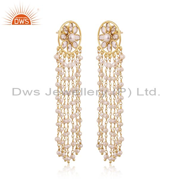 14K Yellow Gold Plated Traditional Handmade Pearl Cz Chandelier Earrings