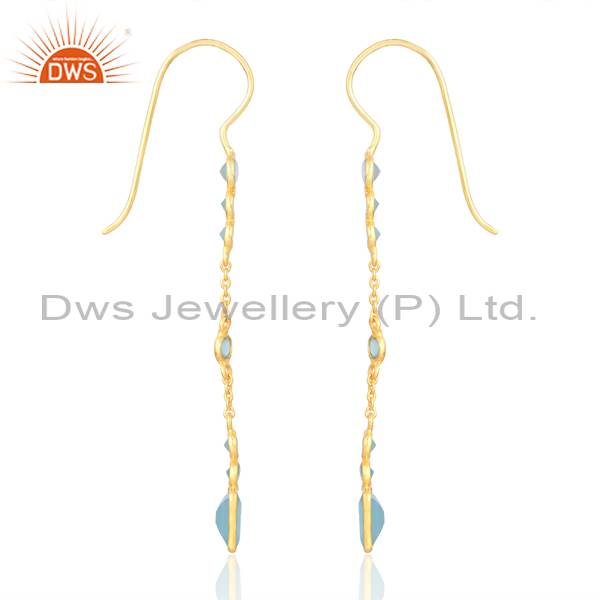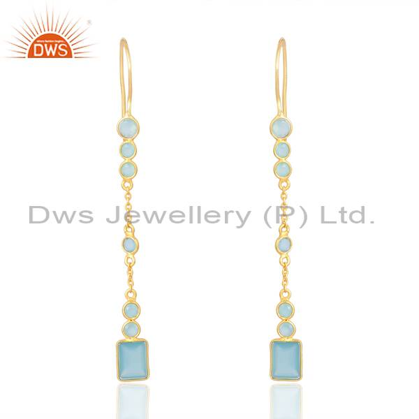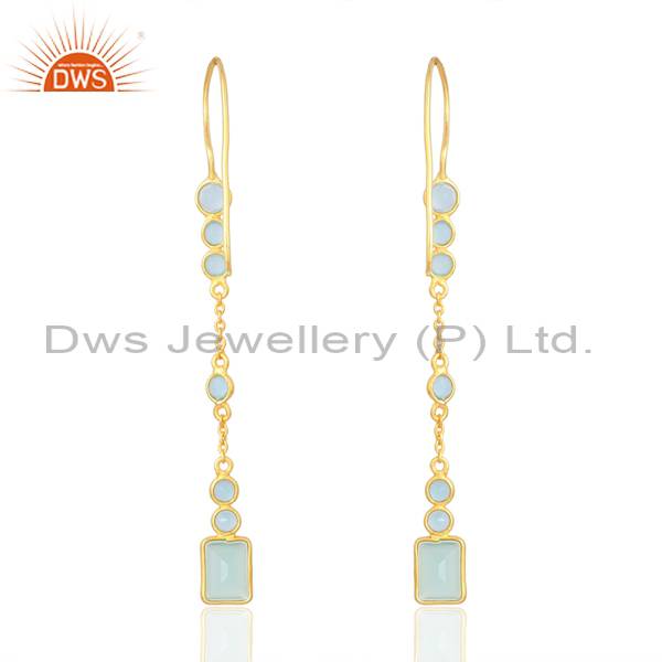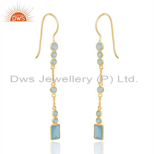 18K Gold Brass Beguette And Round Aqua Chalcedony Earrings