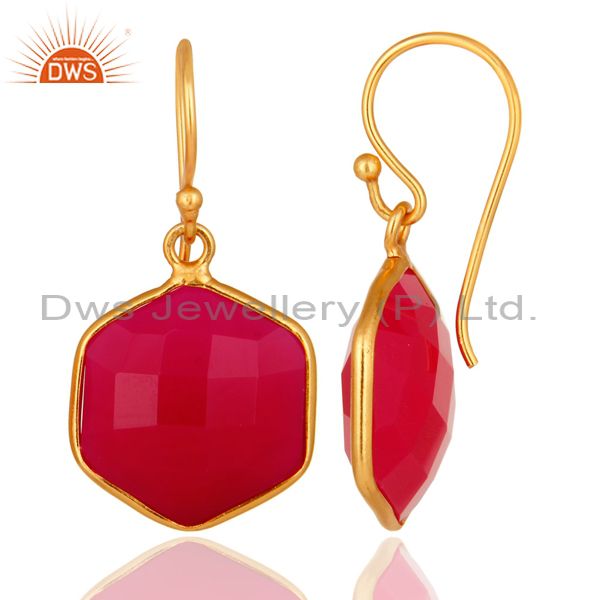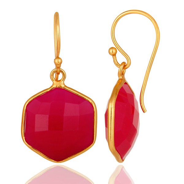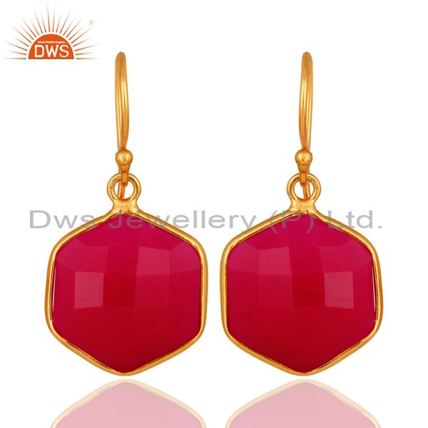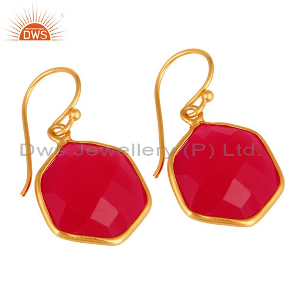 18K Gold On Sterling Silver Faceted Dyed Pink Chalcedony Bezel-Set Drop Earrings
