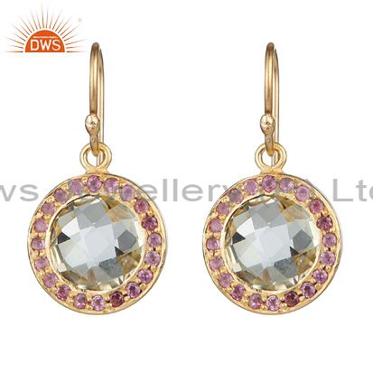 18K Gold Over Silver Lemon Topaz And Pink Tourmaline Halo Style Drop Earrings