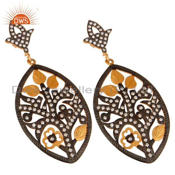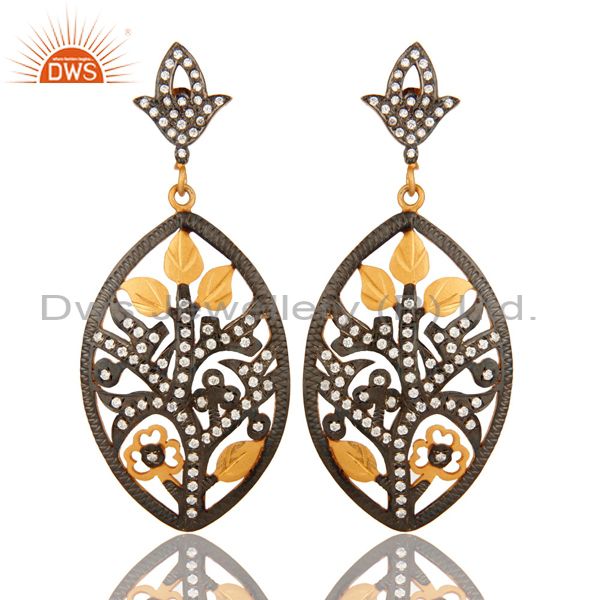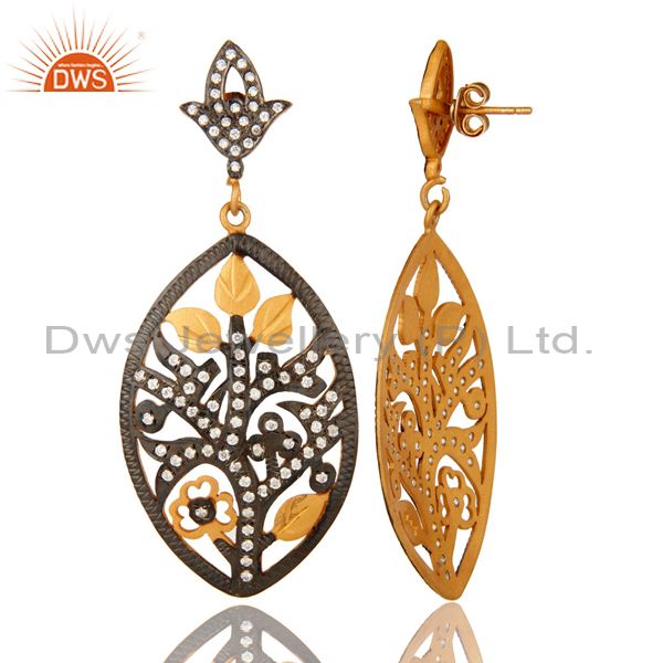18K Gold Over Sterling Silver White Cubic Zirconia Leaf Dangle Earrings