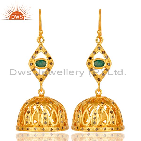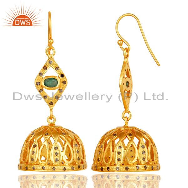18k Gold Plated 925 Sterling Silver Diamond Cut Emerald Jhumka Earrings