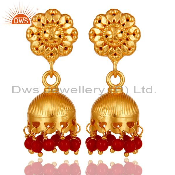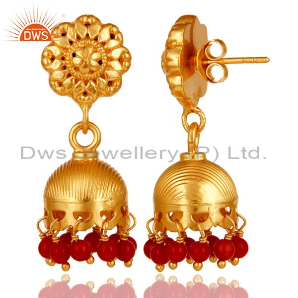 18k Gold Plated 925 Sterling Silver Handmade Jhumka Earrings with Red Coral
