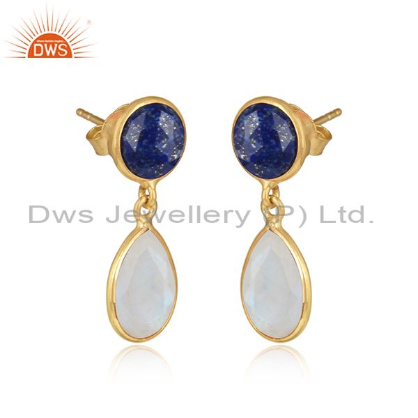 18K Gold Plated 925 Sterling Silver Lapis Moonstone Bezel Set Drops Earrings