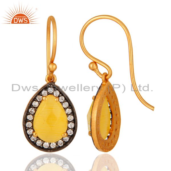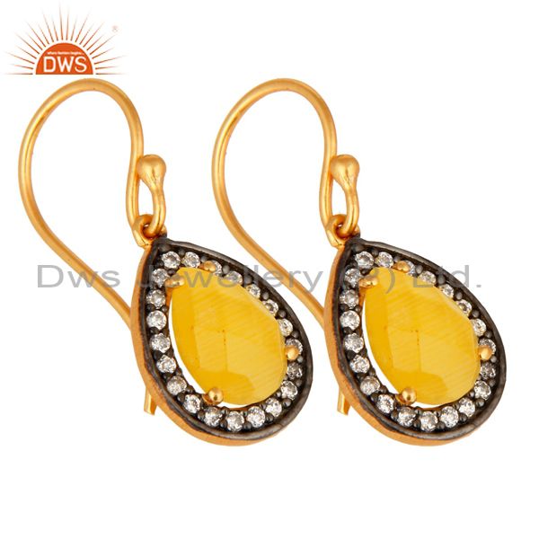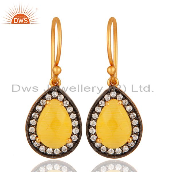 18K Gold Plated 925 Sterling Silver Pave Cz & Yellow Moonstone Designer Earrings