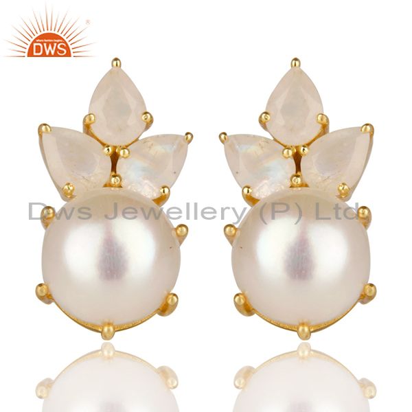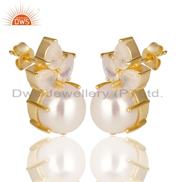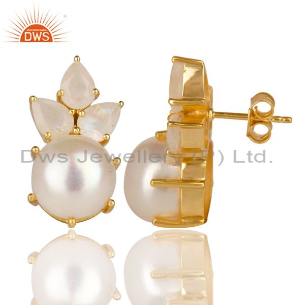 18K Gold Plated 925 Sterling Silver Pearl & Moonstone Prong Set Studs Earrings