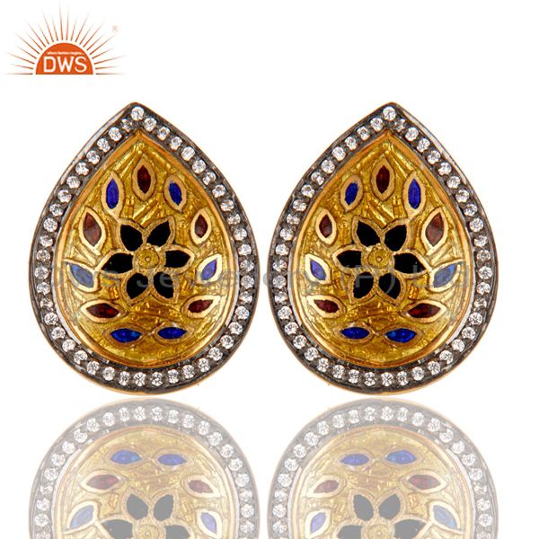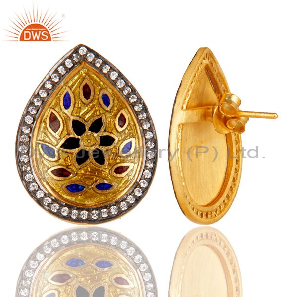 18K Gold Plated 925 Sterling Silver White Zirconia Enamel Studs Earrings