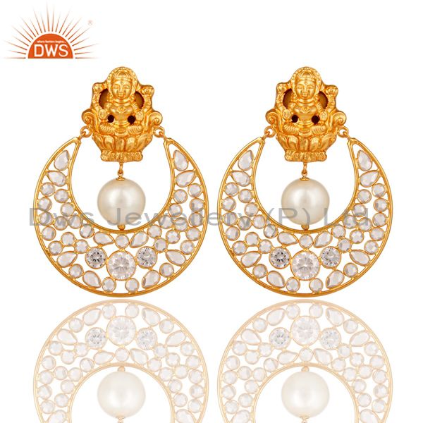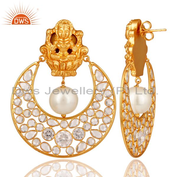 18K Gold Plated Pearl and White CZ Sterling Silver Chand Bali Stud Earring