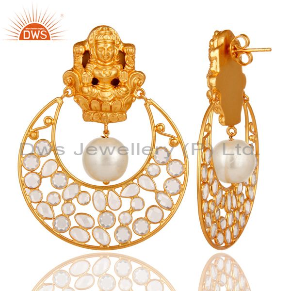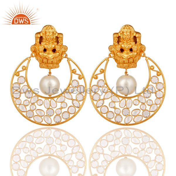 18K Gold Plated Pearl and White CZ Sterling Silver Chand Bali Studs Earrings