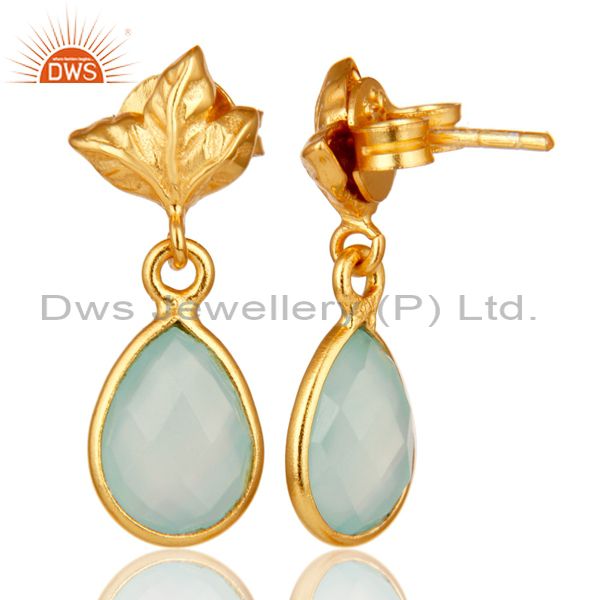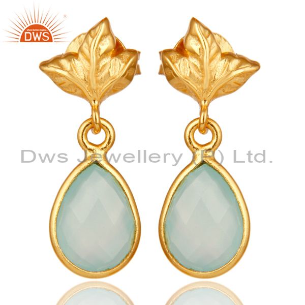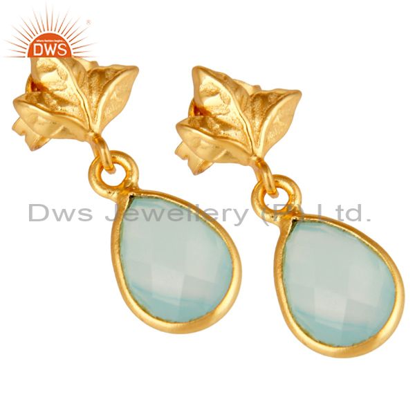 18K Gold Plated Sterling Silver Aqua Chalcedony Dangle Drop Stud Earring