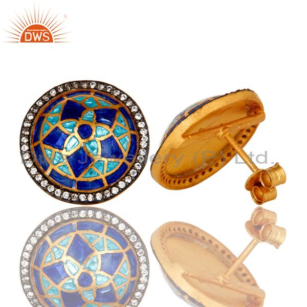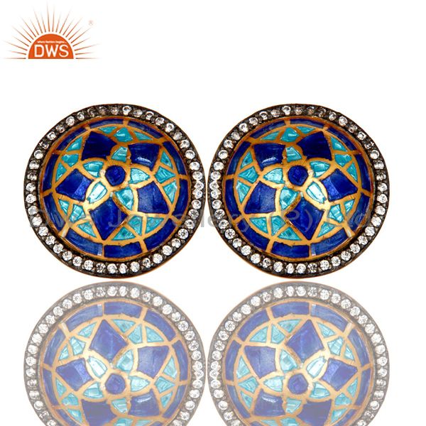 18K Gold Plated Sterling Silver CZ And Blue Enamel Design Round Stud Earrings
