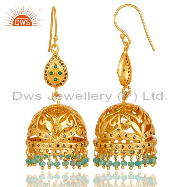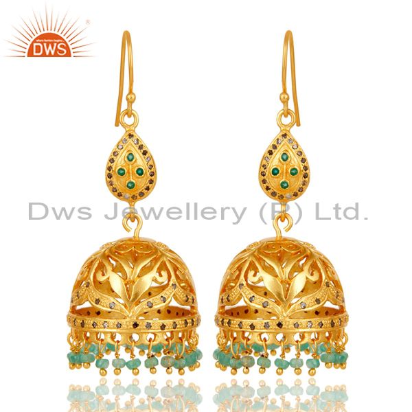 18k Gold Plated Sterling Silver Jhumka Earrings with Diamond & Emerald