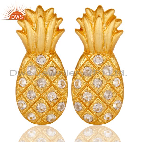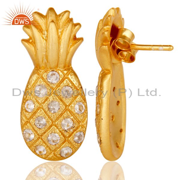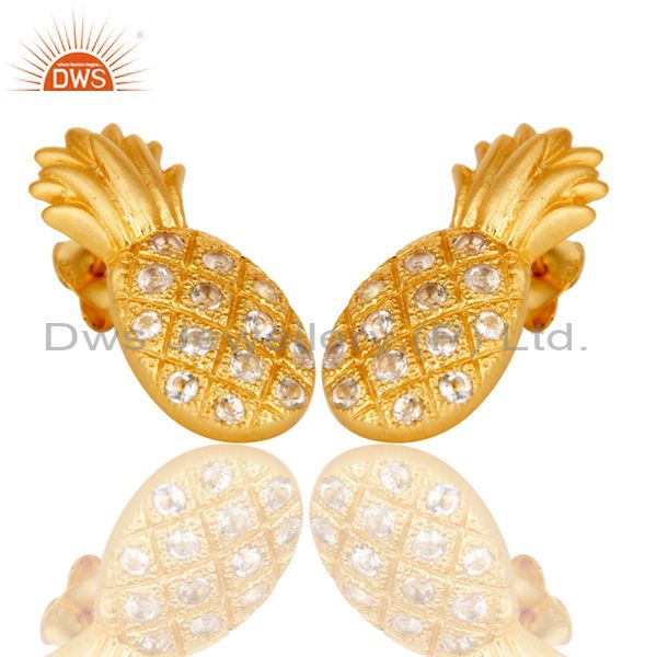 18k Gold Plated Sterling Silver Pineapple Design Earrings with White Topaz