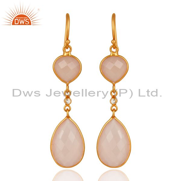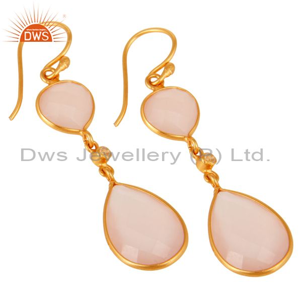 18K Gold Plated Sterling Silver Rose Chalcedony Gemstone Bezel Set Drop Earrings