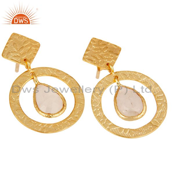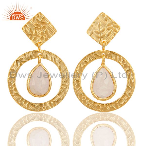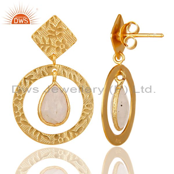 18K Gold Plated Sterling Silver Textured Rainbow Moonstone Bezel Set Earrings