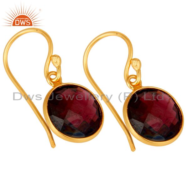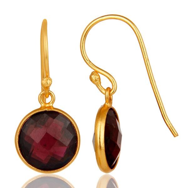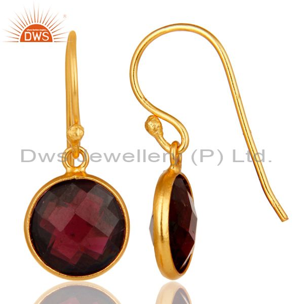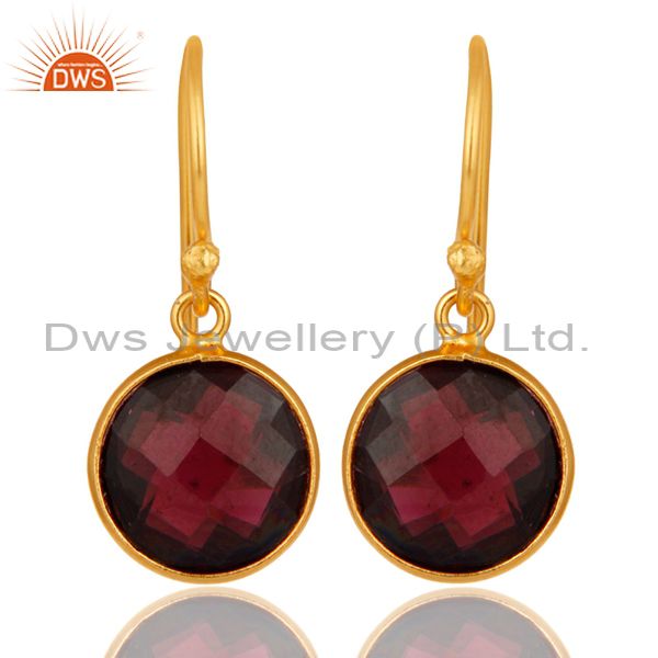 18K Gold Plated With Sterling Silver Garnet Round Cut Bezel Set Dangle Earrings