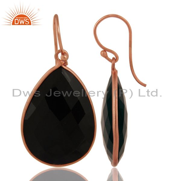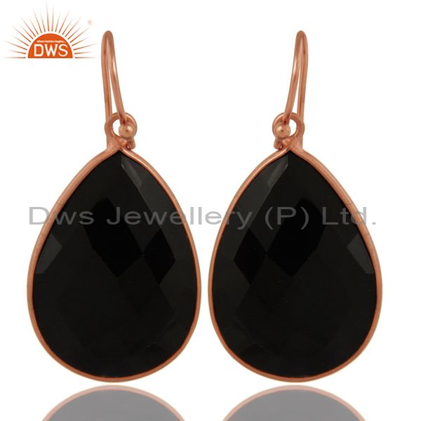 18K Rose Gold Plated Sterling Silver Black Onyx Gemstone Bezel Set Drop Earrings