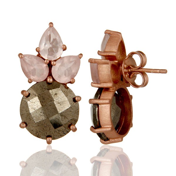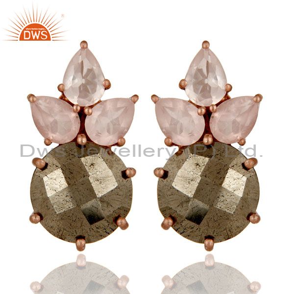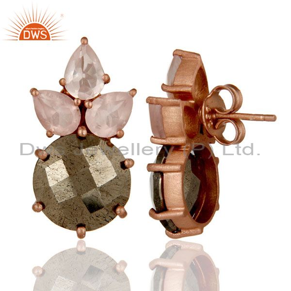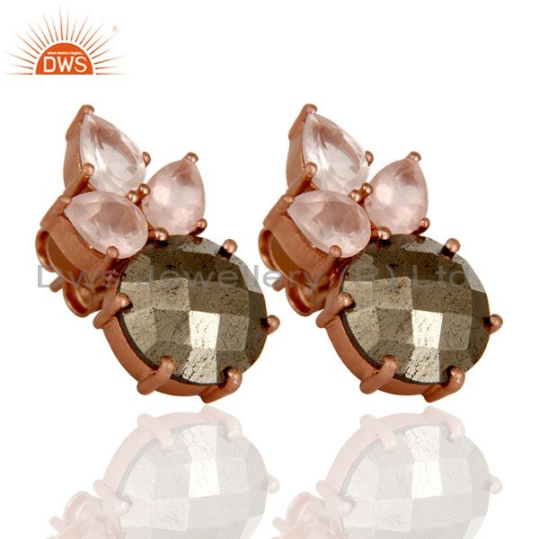 18K Rose Gold Plated Sterling Silver Pyrite And Rose Quartz Post Stud Earrings
