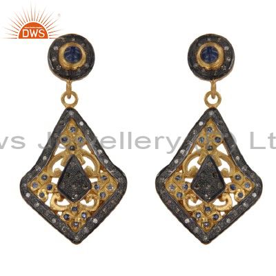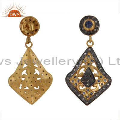 18K Yellow Gold And Sterling Silver Blue Sapphire Pave Set Diamond Earrings