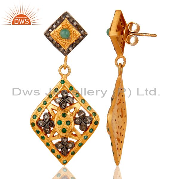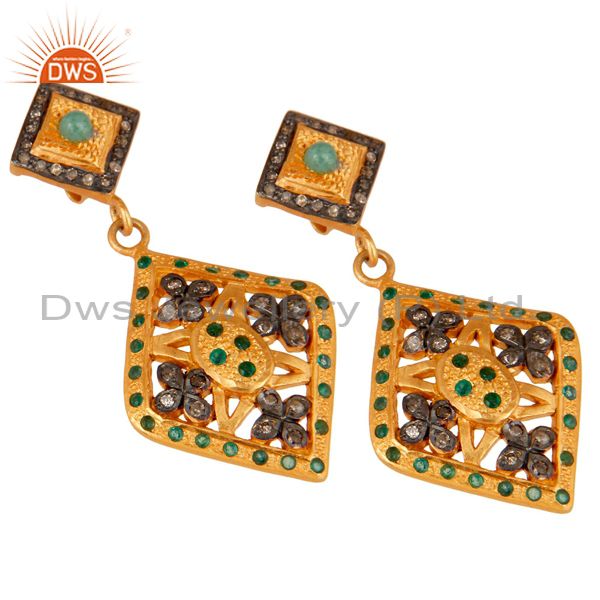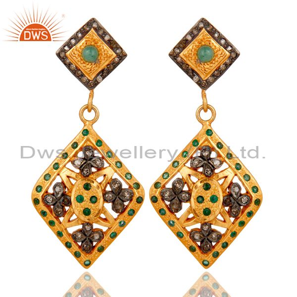 18K Yellow Gold Over 925 Sterling Silver Emerald & Diamond Earrings