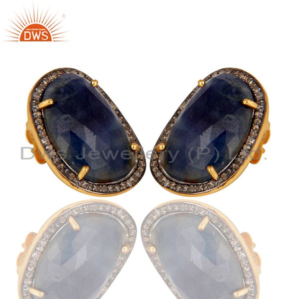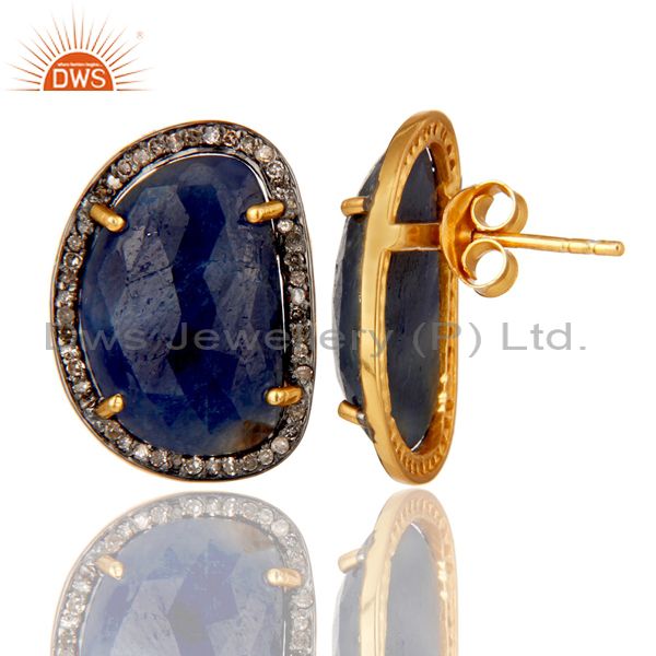 18K Yellow Gold Over Sterling Silver Blue Sapphire and Diamond Stud Earrings
