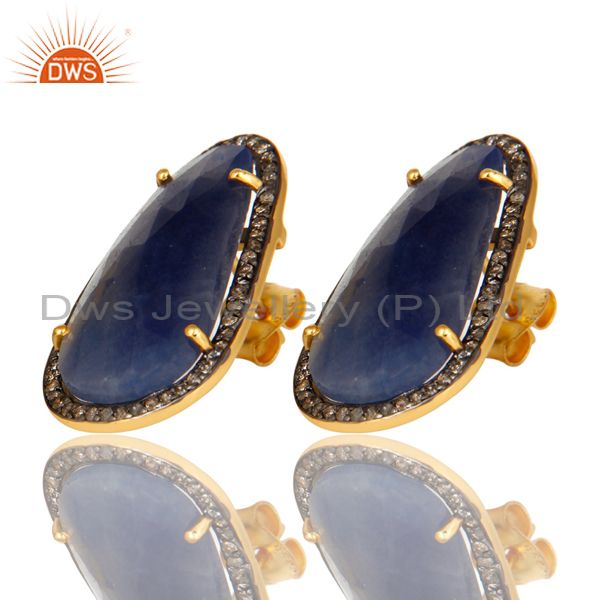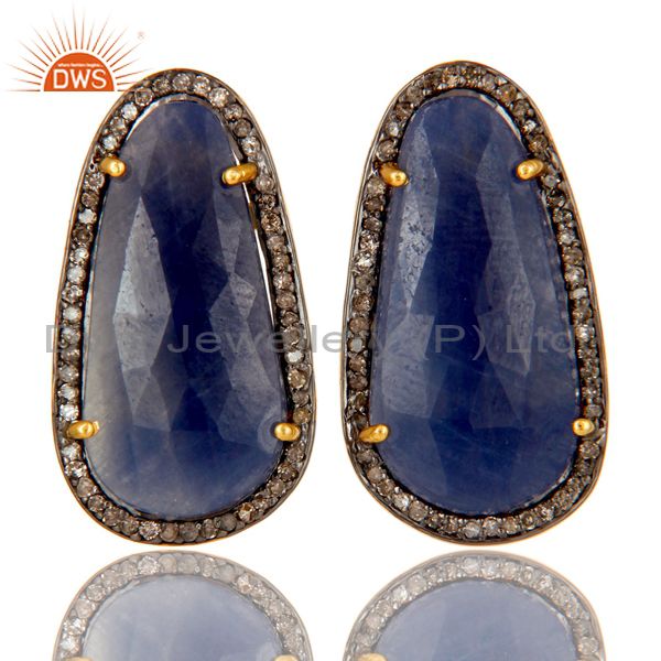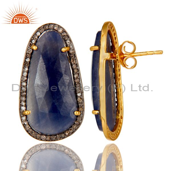 18K Yellow Gold Over Sterling Silver Blue Sapphire Pave Diamond Stud Earrings