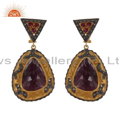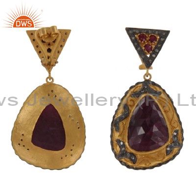 18K Yellow Gold Over Sterling Silver Pave Set Diamond Ruby Dangle Earrings