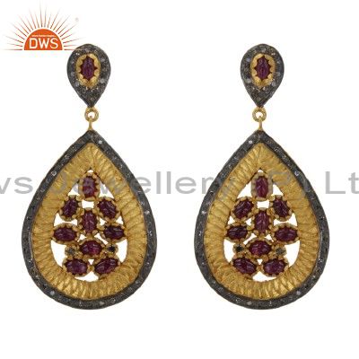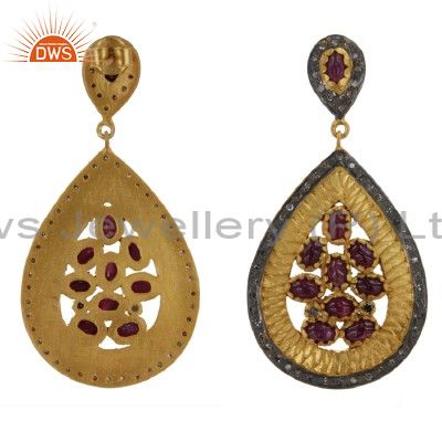 18K Yellow Gold Over Sterling Silver Pave Set Diamond Ruby Teardrop Earrings