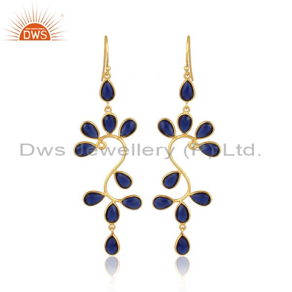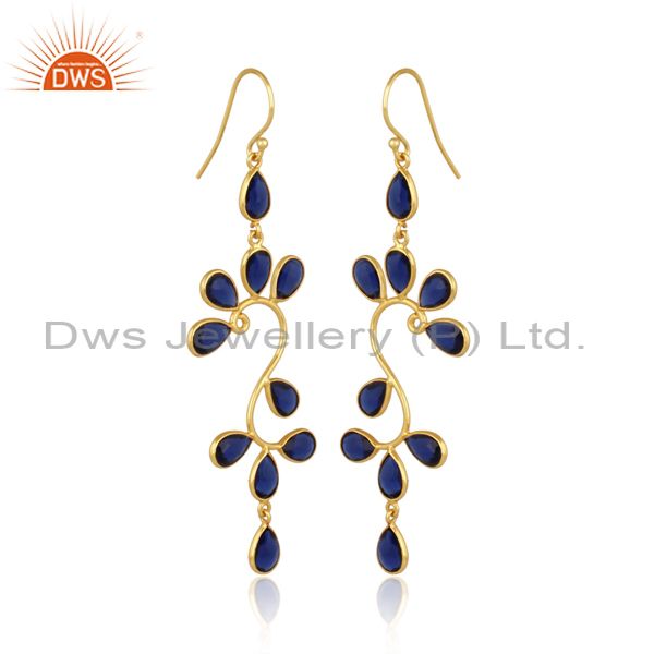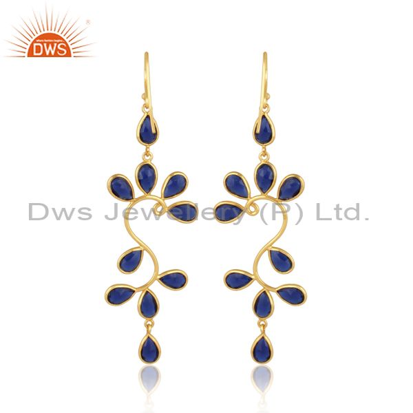 18K Yellow Gold Plated 925 Sterling Silver Blue Corrundum Dangle Earrings