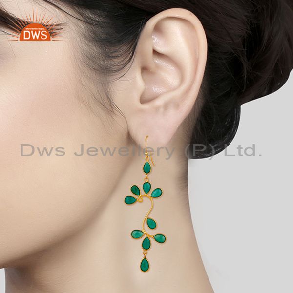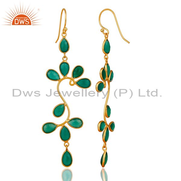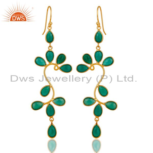 18K Yellow Gold Plated 925 Sterling Silver Green Onyx Gemstone Dangle Earrings