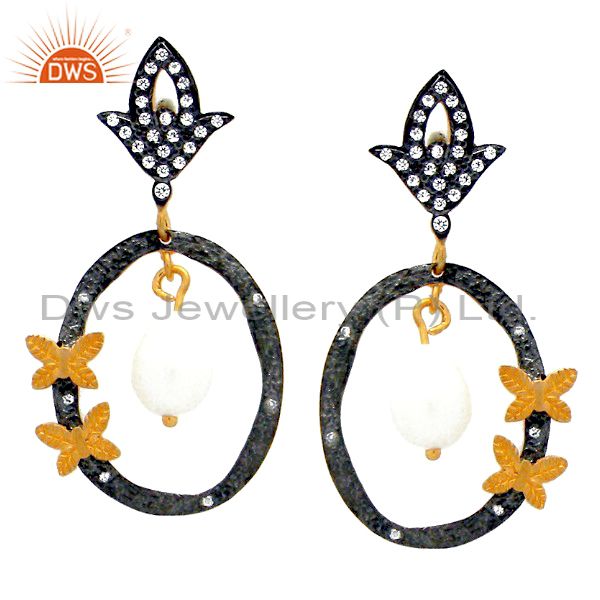 18K Yellow Gold Plated And Oxidized Sterling Silver Pearl And Cz Dangle Earrings