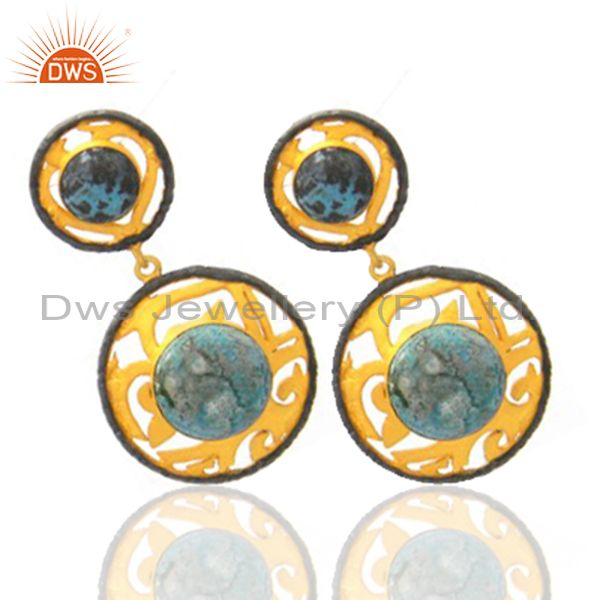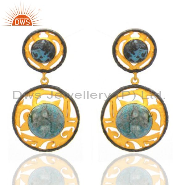 18K Yellow Gold Plated Brass Chrysocolla Gemstone Designer Dangle Earrings