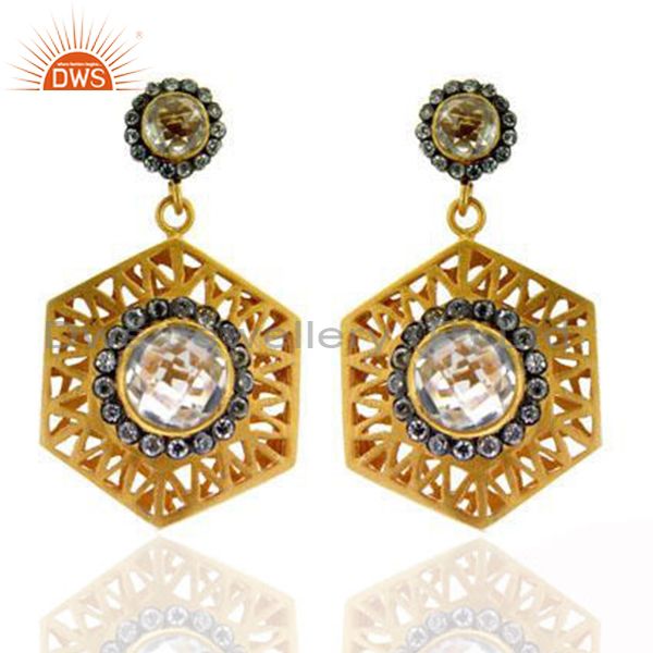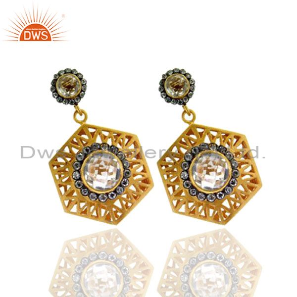 18K Yellow Gold Plated Brass Cz And Crystal Quartz Designer Dangle Earrings