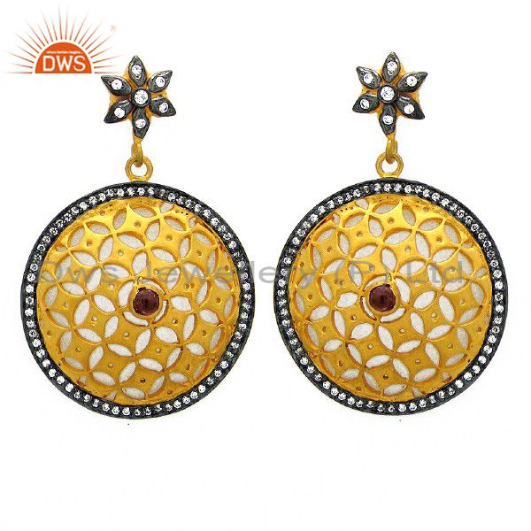 18K Yellow Gold Plated Brass Cz And Pink Tourmaline Filigree Disc Dangle Earring