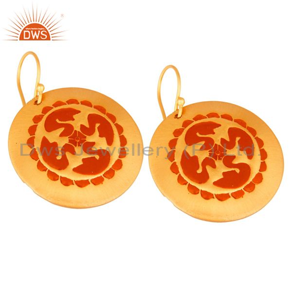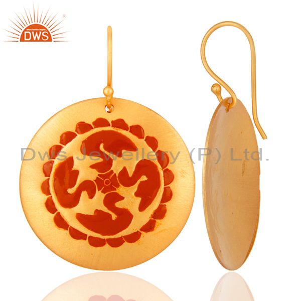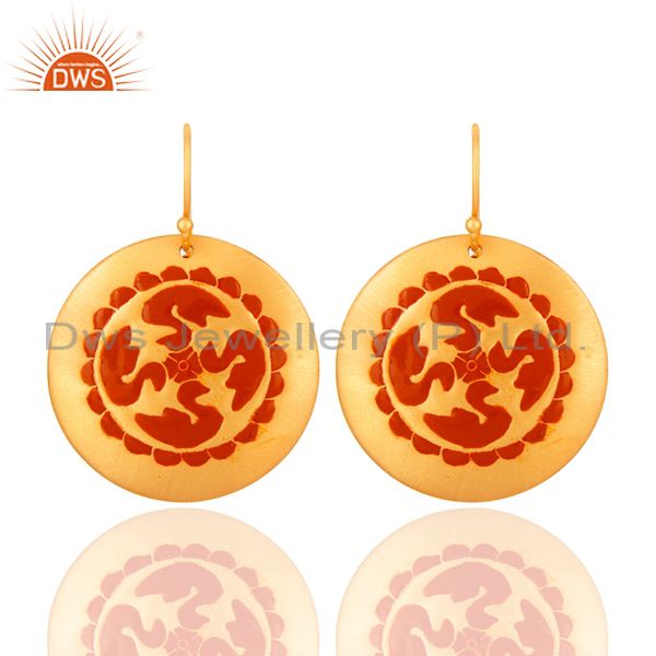 18K Yellow Gold Plated Brass Handmade Orange Enamel Round Disc Earrings