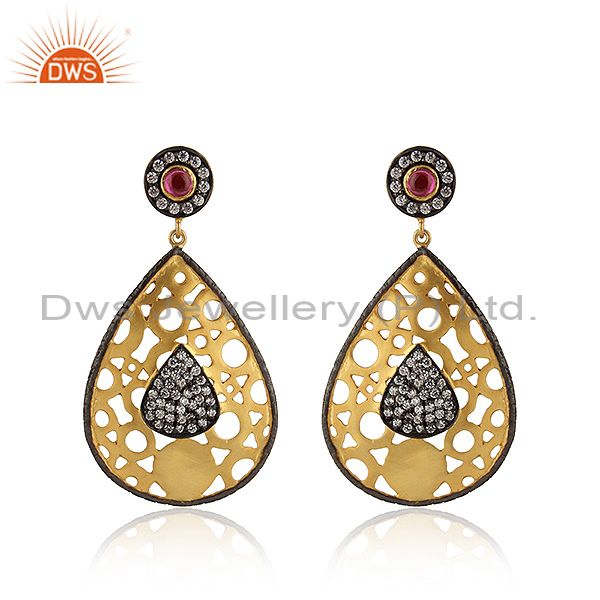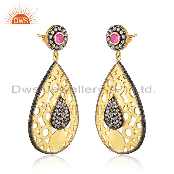 18K Yellow Gold Plated Brass Pink Hydro And Cz Filigree Dangle Earrings