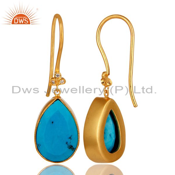 18K Yellow Gold Plated Brass Turquoise Bezel Set Dangle Earrings With CZ