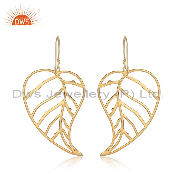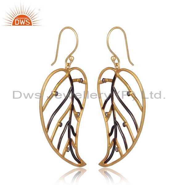 18K Yellow Gold Plated Cubic Zirconia Pan Leaf Design Dangle Brass Earring