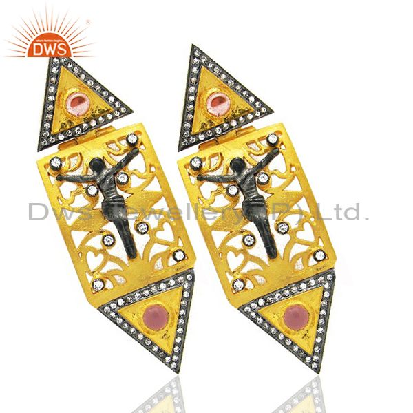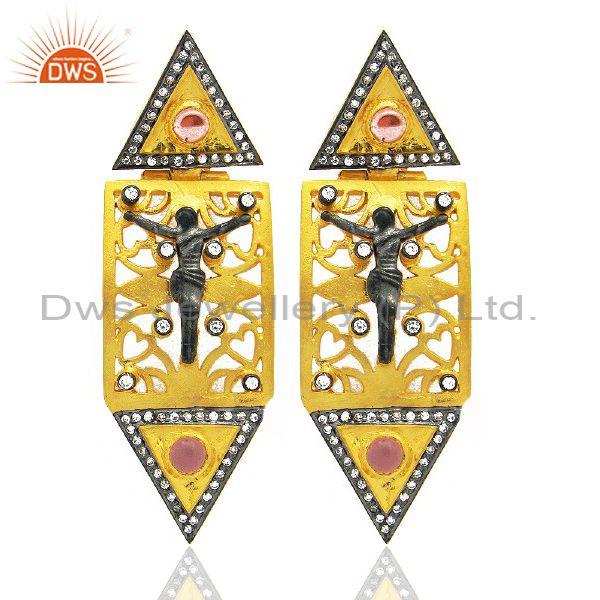 18K Yellow Gold Plated Cz And Pink Glass Jesus Christians Dangle Earrings
