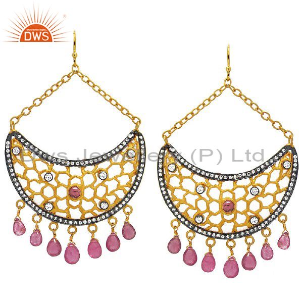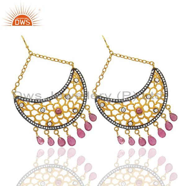 18K Yellow Gold Plated Cz And Pink Tourmaline Half Moon Chandelier Earrings