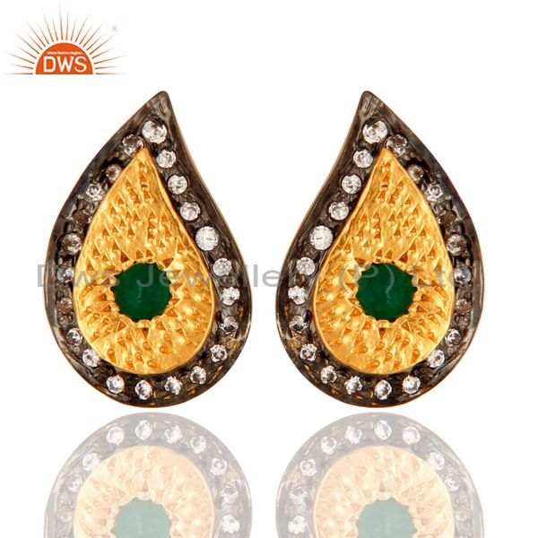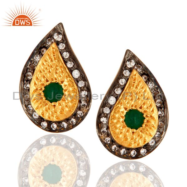 18k Yellow Gold-Plated Green Aventurine And CZ Teardrop Stud Earrings