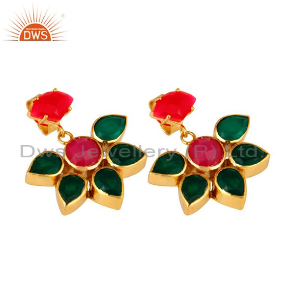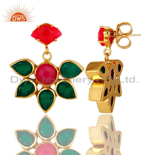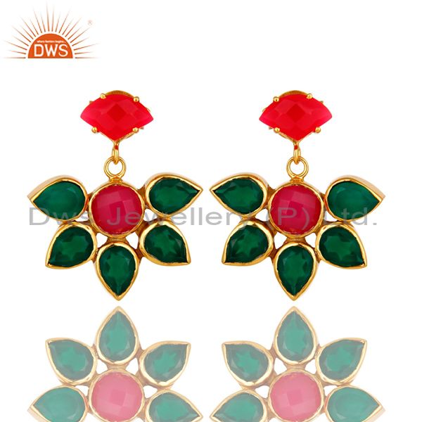 18K Yellow Gold Plated Green Onyx And Pink Chalcedony Gemstone Dangle Earrings