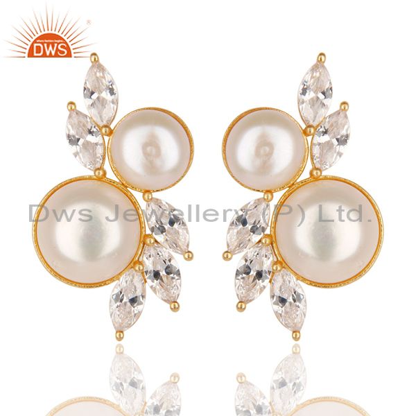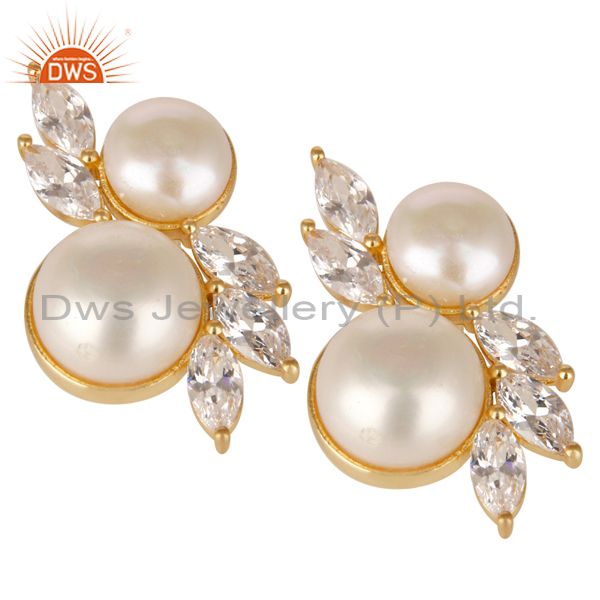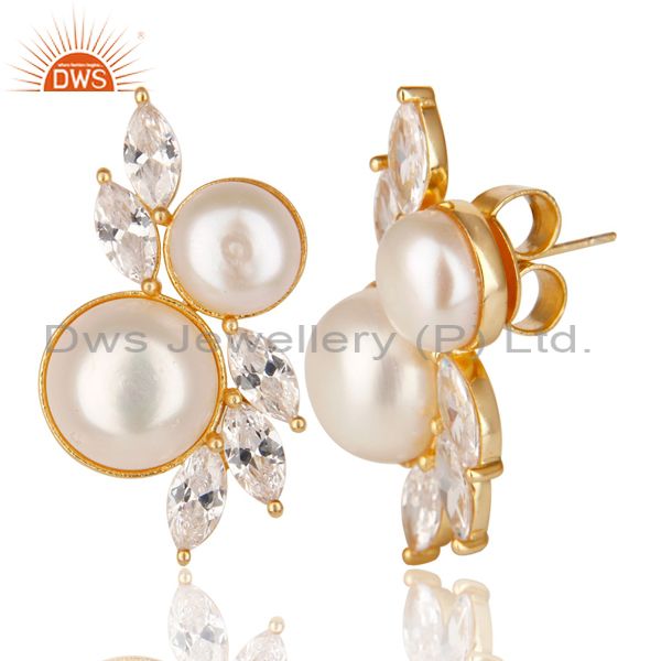 18K Yellow Gold Plated Handmade Pearl & White Zirconia Brass Studs Earrings