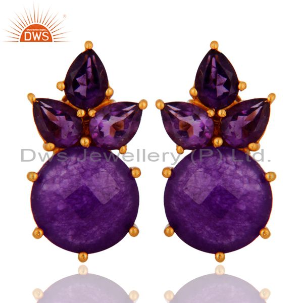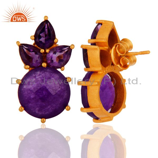 18K Yellow Gold Plated Purple Aventurine And Amethyst Cluster Post Stud Earrings